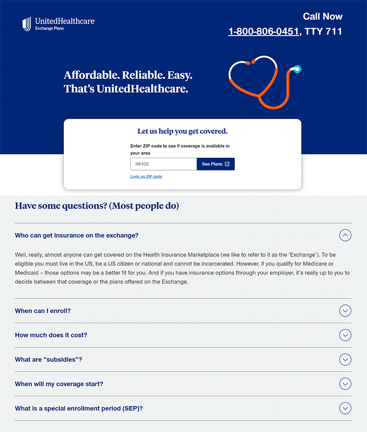United Healthcare has a website dedicated to informing the public about their exchange plans. The website features easy-to-spot customer service phone numbers, simple calls-to-action, a straightforward and informative FAQ section, and details about three plan options.