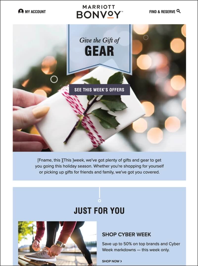 To celebrate the holidays and show appreciation for their loyalty program members, Marriott Bonvoy created their “Give the Gift” email series. The campaign shared special offers and ideas for travel, and unique gifts for loved ones during the winter season. The 4-part series was themed around giving the gift of time, gear, travel and points – offering ideas for creating magic moments with friends and family through incredible experiences and unique items.